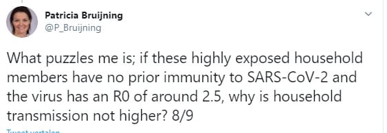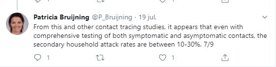 Wat mevrouw Bruijning maar niet kan verklaren, heeft dus alles te maken met die oogkleppen. Ze probeert alles te verklaren vanuit de besmetting via grote druppels en dan zijn de percentages thuis inderdaad laag. Maar als ze -los van het overweldigende internationale onderzoek naar aerosols- vanmorgen het AD had opengeslagen of het NOS Journaal had bekeken, dan had ze de uitkomsten kunnen weten van het aerosol onderzoek dat al een tijd aan de Universiteit Twente loopt. Maar zolang het belang van die zwevende minidruppels door RIVM en onze deskundigen die op tv verschijnen, inclusief De Gouw, worden genegeerd of gebagatelliseerd en mensen niet gewaarschuwd worden t.a.v. het handhaven van goede ventilatie, dan blijven die clusters ontstaan.