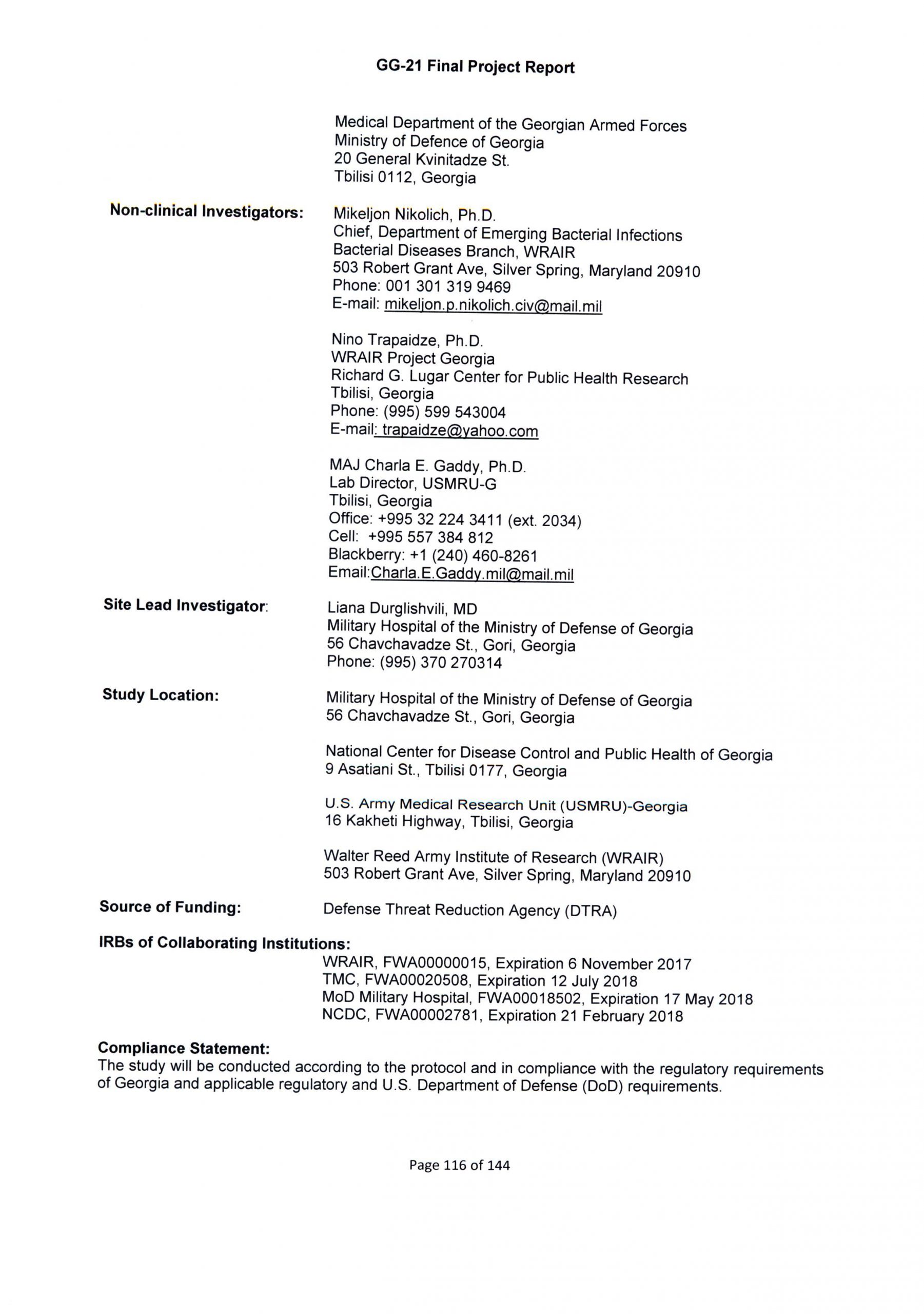 Een dergelijke procedure kan niet tot de dood leiden. Volgens het projectrapport zullen echter “alle sterfgevallen door vrijwilligers onmiddellijk – meestal binnen 48 uur nadat de hoofdonderzoeker op de hoogte is gesteld” – worden gemeld aan het Georgische Militair Hospitaal en WRAIR, VS.